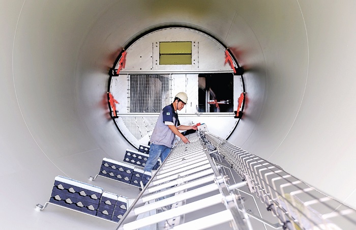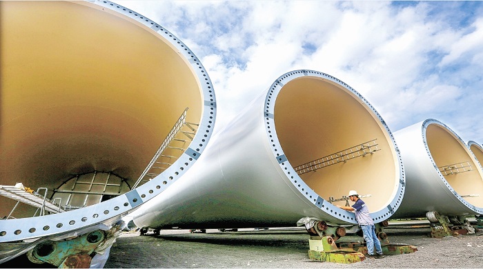 三季度,市開發區風電設備生產企業訂單充足,工人們加緊趕制外貿訂單產品,滿足市場需求。圖為9月18日,市開發區重山風力設備制造企業車間內,工人在趕制風電塔架。