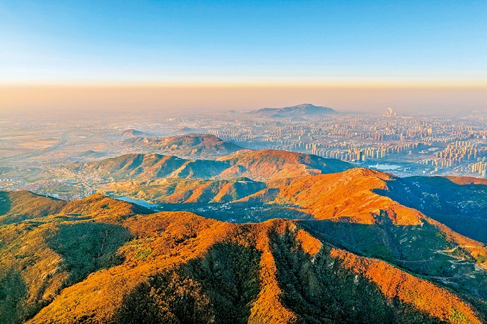 11月19日,晨曦中的花果山色彩斑斕。初冬時節,花果山層林盡染,宛如一幅天然畫卷,美不勝收。